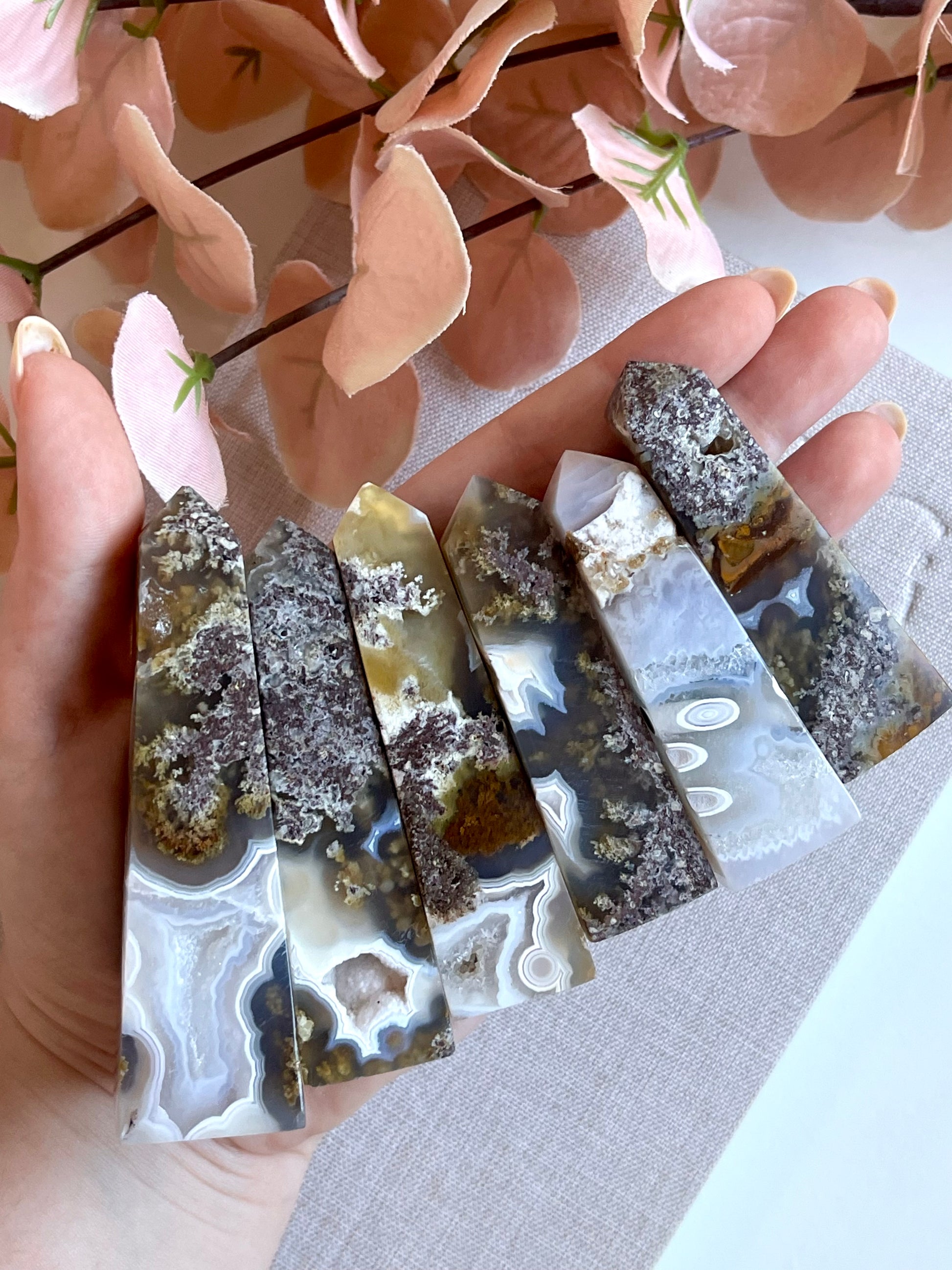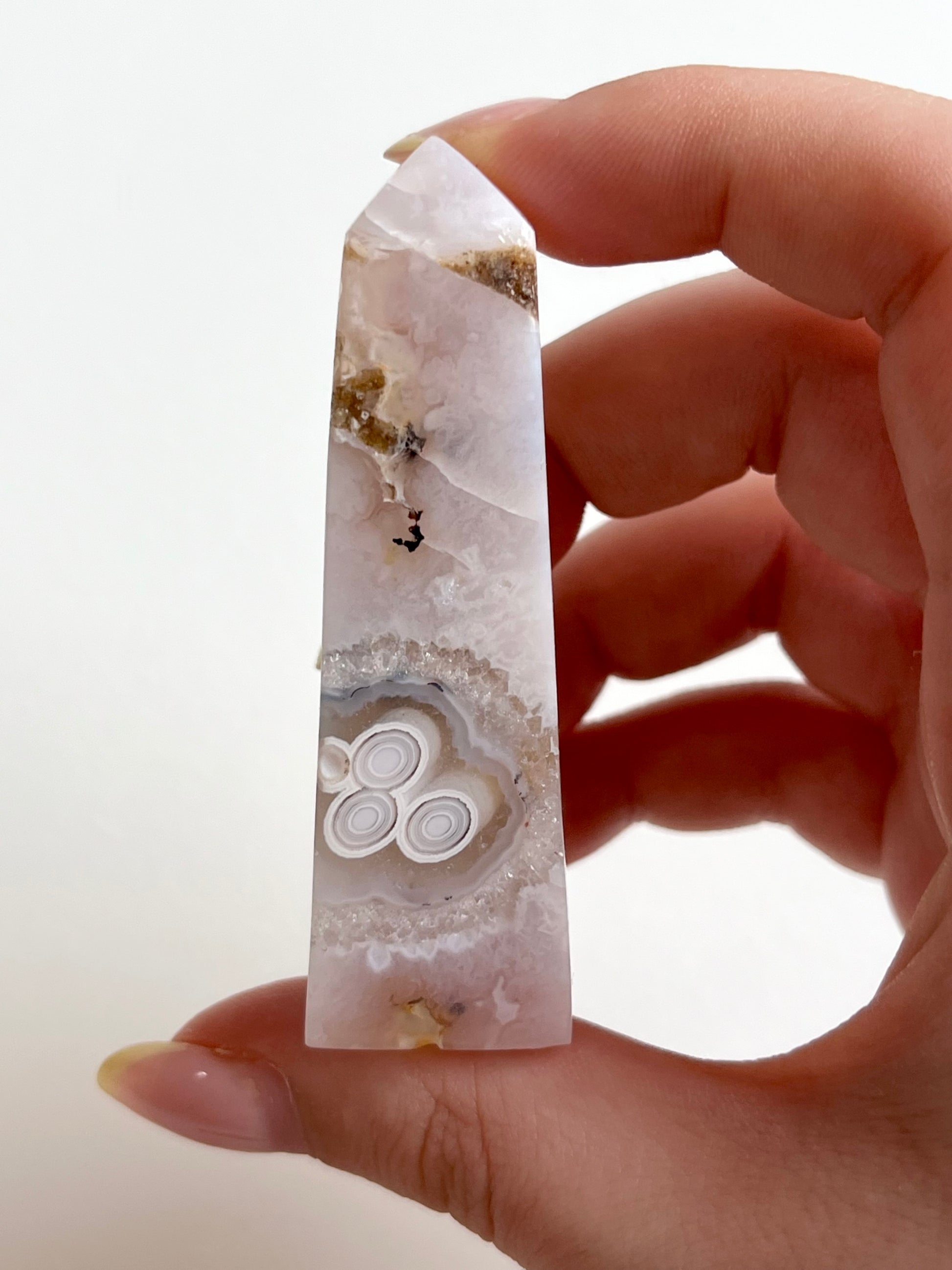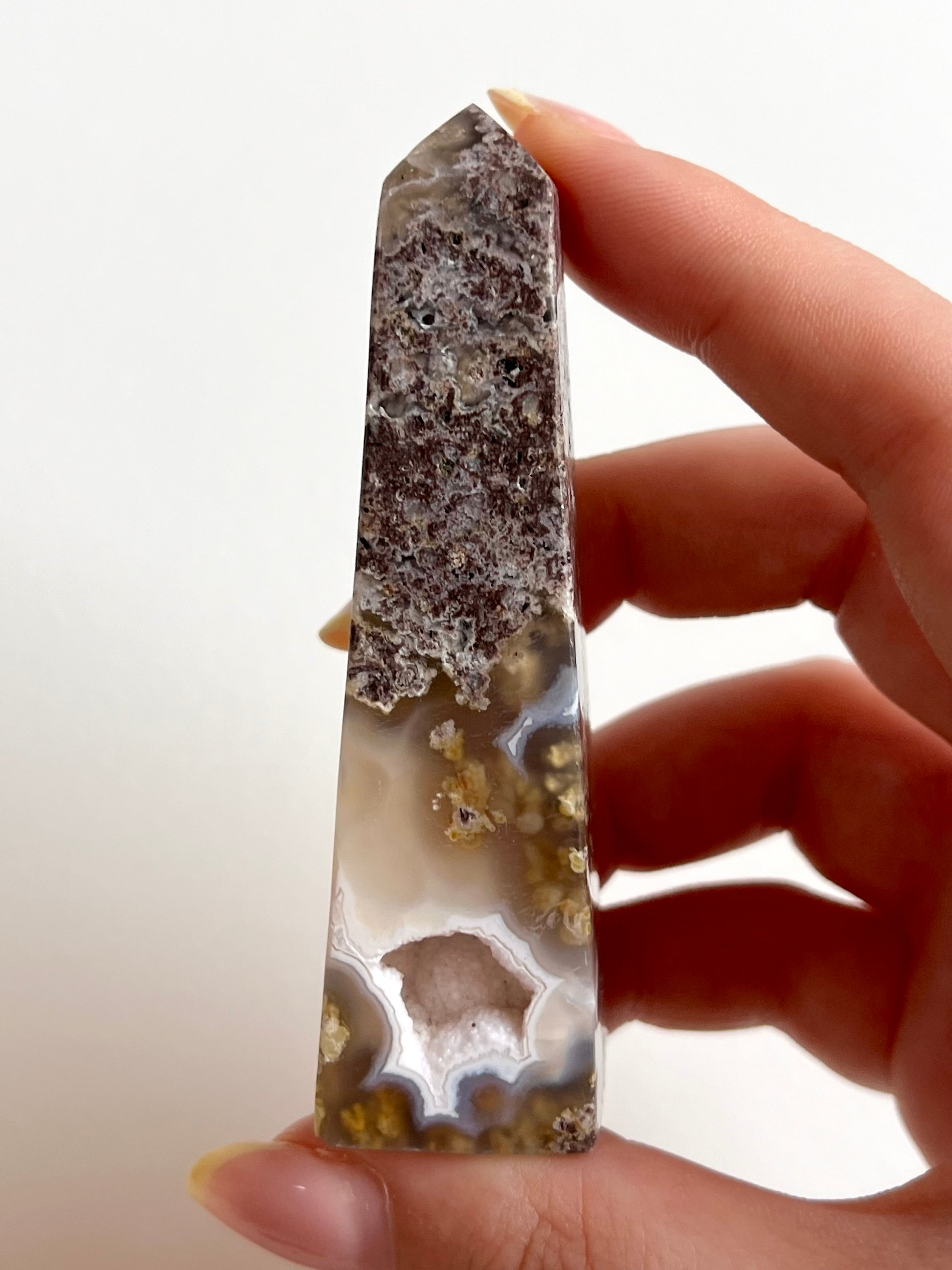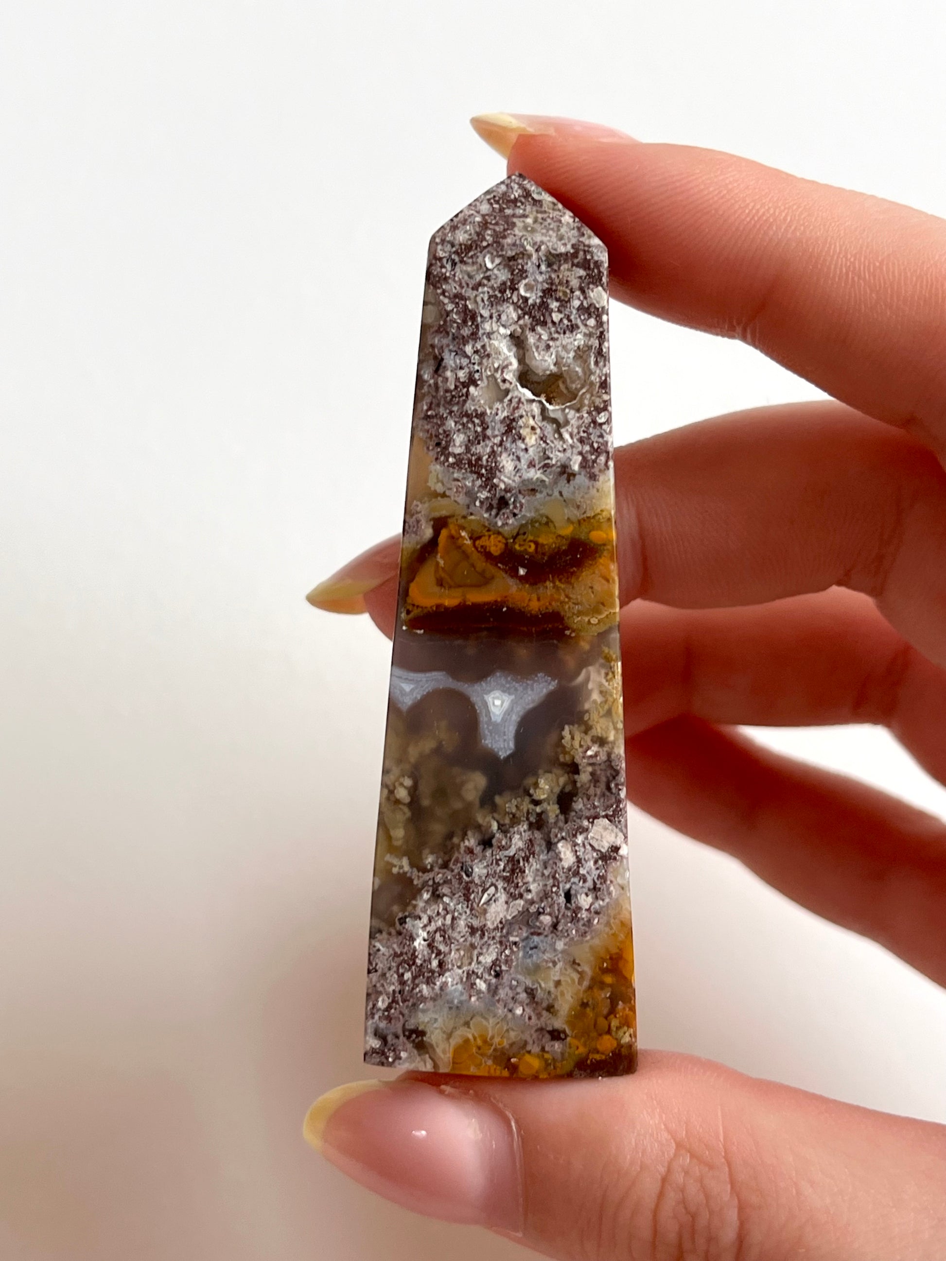 L'Agata Nebula è una pietra molto particolare proveniente dall’Indonesia. È Una tipologia di muschiata che presenta sfumature sui toni del rosso, del giallo e del viola ecc ma a differenza della classica muschiata ha anche altri dettagli. Ad esempio possiamo trovare delle bande che talvolta formano dettagli orbicolari, inclusioni dentritiche e del quarzo